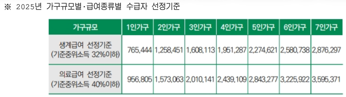 | 의료급여 | 중위소득의 40% | 약 102만 원 | 약 259만 원 |